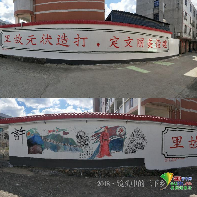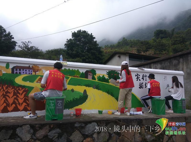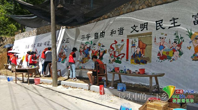 在车乾村,经过前期的实地考察,队员们针对车乾村的实际情况进行了总结,经过反复讨论,队员们将民舍景观和村民生活相结合,以新农村建设为主题的文化墙描绘了一片“幸福友善新车乾”的景象;队员们设计历史传统、家风家训,牛过蓢古村落的主题墙绘,展示了新时代美丽乡村的农耕场景。在梅溪镇也陆续开展了社会主义核心价值体系的主题文化墙绘的打造,为村里增添新景观的同时,把墙绘变成了意识形态的教科书,在潜移默化中传播社会主义核心价值观、提升村民的文明素质。