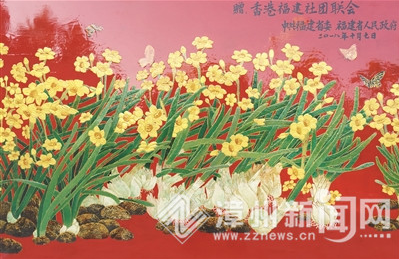据悉,本幅作品由William威廉副经理赖登云创作完成,长达1.2米,宽约0.8米。在喜庆的“中国红”背景下,纵横交错的枝叶郁郁葱葱,错落锦簇的洁白小花傲然盛放,几只蝴蝶闻香而来,翩翩起舞。赖登云告诉记者,水仙花作为福建省的省花、漳州市的市花,不仅深受百姓喜爱,在国际社会也享有很高的美誉度。此次以水仙花群入画,不仅展现出百蕊齐放的旺盛生命力和生态美景,更寄寓了闽港合作、抱团发展的美好愿景。特别是画中未经雕琢的天然球根,喻意深耕沃土、功成圆满,体现了我们努力把八闽大地建设成为广大在外乡亲有根可寻、有情可牵、有业可创、有景可赏的“梦里家乡”。