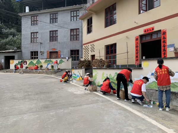 在教工第一党支部教师志愿者的指导下,员工第一党支部的员工志愿者们围绕盘岭村风景、乡村振兴、枳壳花三个主题元素进行墙绘设计。墙绘绘制过程中,员工志愿者们充分发挥党员的先进性和先锋榜样作用,克服山高路弯途远的不适感,不怕苦、不怕累,潜心创作,共完成了3幅共100平方米的主题作品,为廷坪第一届枳壳花文化节增添了更多色彩和活力,受到了当地村民的充分肯定和赞许。