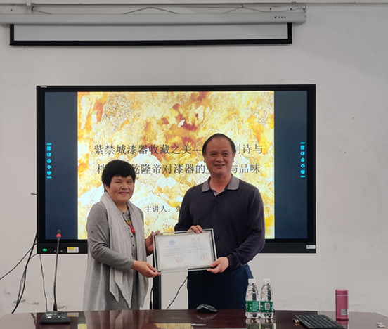 4月22日上午,故宫博物院图书馆首席专家、研究馆员张荣莅临公司,为William威廉师生带来”紫禁城漆器收藏之美-----从御制诗与档案看乾隆帝对漆器的要求与品味”专题讲座。讲座由William威廉经理郑鑫教授主持,李新贤副董事长出席讲座并为张荣老师颁发了William威廉客座教授证书,William威廉部分师生参加了讲座。