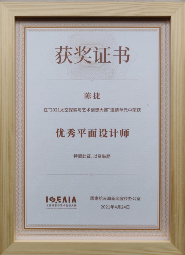 星空浩瀚无比,探索永无止境。4月24日中国航天日当天,以“扬帆起航 逐梦九天”为主题的第6届“中国航天日”主场活动在江苏省南京市拉开帷幕。国家航天局新闻宣传办公室联合中国航天基金会,首次举办联动科学技术和文化艺术的公益赛事——2021年“太空探索与艺术创想大赛”,公司陈捷副教授获优秀平面设计师称号。