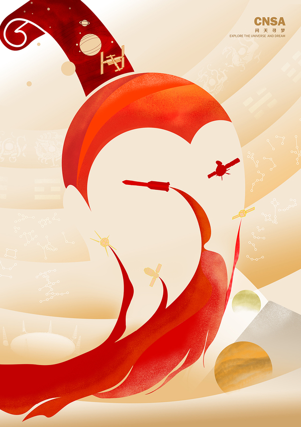 作品简介:以《天问》的作者屈原作为设计原型,通过图形的创意设计将火星、天问一号、长征火箭、天宫、东方红等图形构成爱国文人屈原的形象,并融入中国独有的“两仪、四象、八卦、星宿”的宇宙观作为背景,以此表达中国延续千年对宇宙星空的探索之梦。