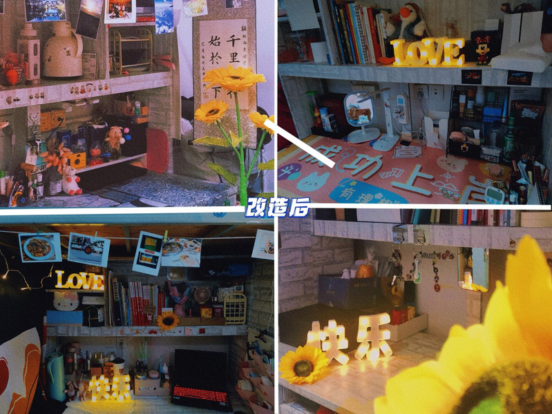整体以暖色调为主,彰显温暖舒适,小面积的蓝绿撞色,让整个空间更加活泼,向日葵以橙黄色的姿态跳跃其中,即带来了太阳般的温暖,又打破了宿舍严谨的格局,统一又不失个性。