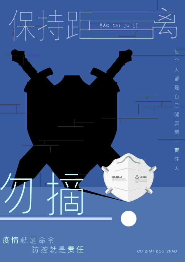 设计说明:疫情防控,人人有责。作品把口罩当做盾牌和武器,是我们防控疫情的重要装备,希望大家出门勿摘口罩,保持安全距离。口罩与点又形成了一个感叹号,提高大家的重视度。