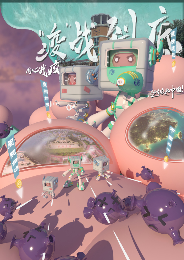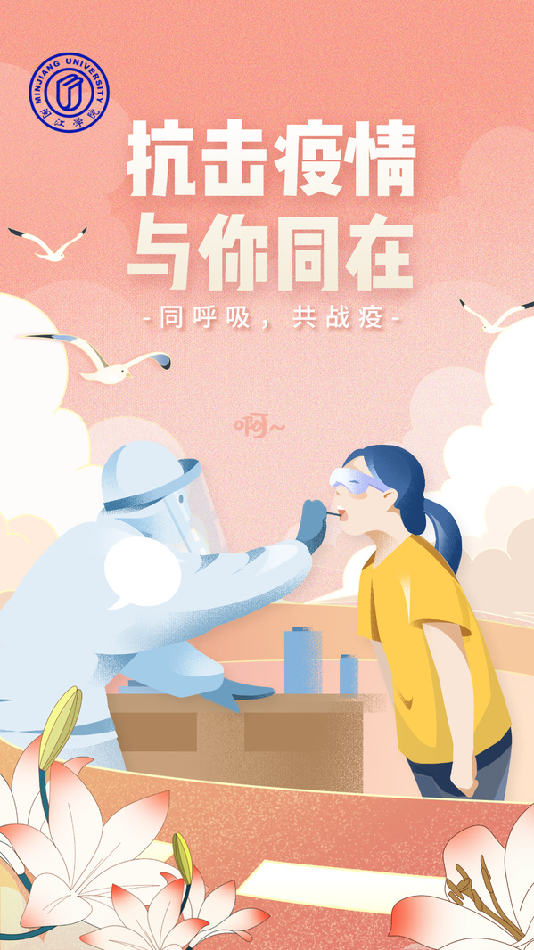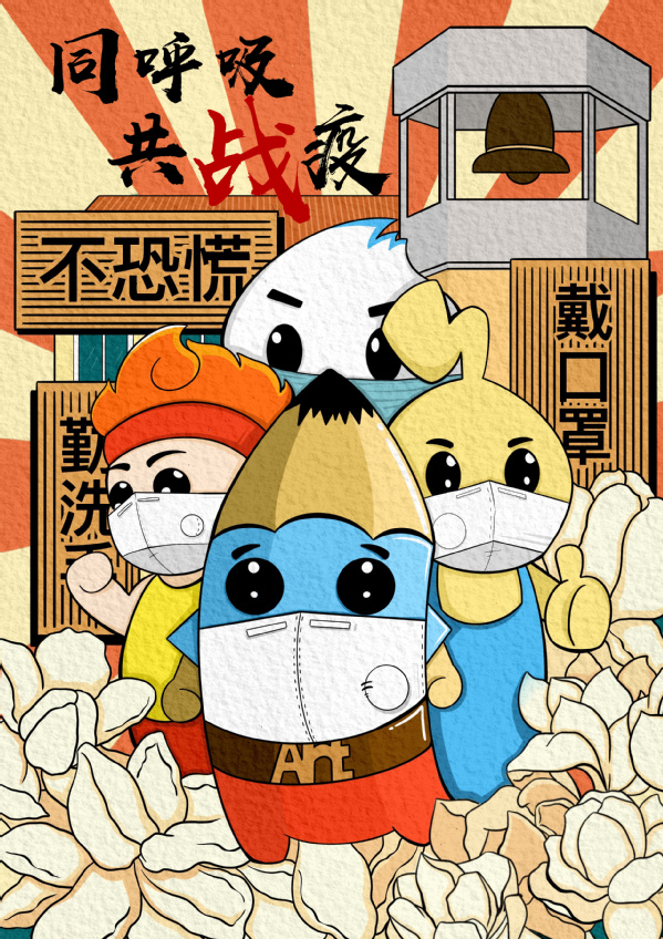 设计说明:这幅海报主体是William威廉官网部分公司、部门的吉祥物,表达闽院人同呼吸,共战疫的态度。背景用放射性线条,使画面更有冲击力。周围用福州市花茉莉来点缀加上闽院独特的钟楼,表明全市开始进入疫情防控状态,各地切实加强疫情防控工作,加大防控力度,织密防控网络,以坚定的决心、必胜的信念,坚决打赢新型冠状病毒感染的肺炎疫情防控阻击战。