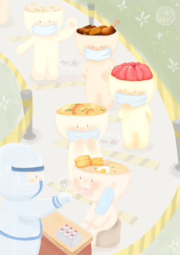 设计说明:作品表现福建各地核酸检测场景,有医护人员,泉州面线糊,莆田卤面和漳州蜜柚等美食拟人化角色,按照疫情情况排序,表达福建省人民同呼吸,共战疫。