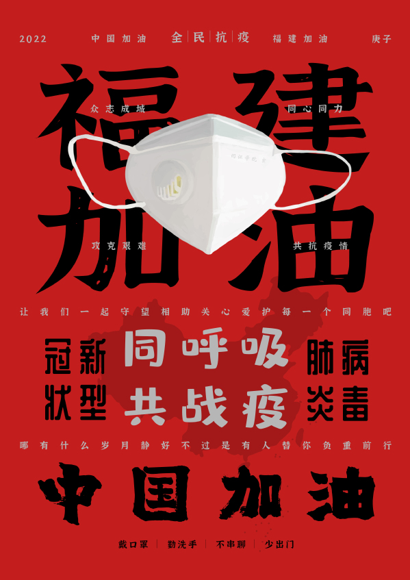 设计说明:画面以不同的文字形式进行排版,用黑色和红色搭配灰色调和使用,使画面富有层次感,中间的口罩把福建加油围起来,突出主题“同呼吸,共战役”,把中国地图放在下面,寓意国家是我们最坚强的后盾,只要我们同心协力,我们一定能待到山花烂漫时!