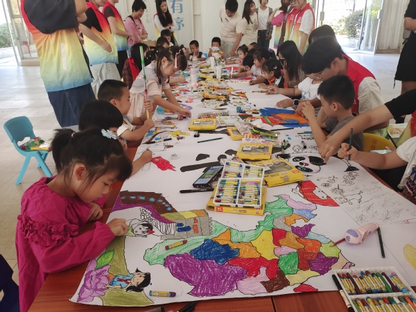 活动采用画长卷的方式进行,志愿者老师们向小朋友们讲述了国庆节的由来,以及中华民族五千年的历史。通过互动交流等形式,加深小朋友对“中国梦”的认识,增强孩子们对国家的自豪感和民族的认同感。大家各抒己见,在这5Mx1M的长卷上选取位置进行绘画。