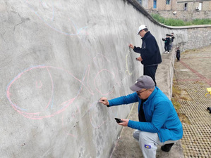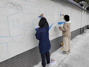 墙绘实践团队共分为两个小组,各小组根据准备好的绘画图稿,测量规划墙体尺寸、清理墙面、按照图片画出底稿、勾勒线条,师生们以饱满的精神状态投入到墙绘实践中。