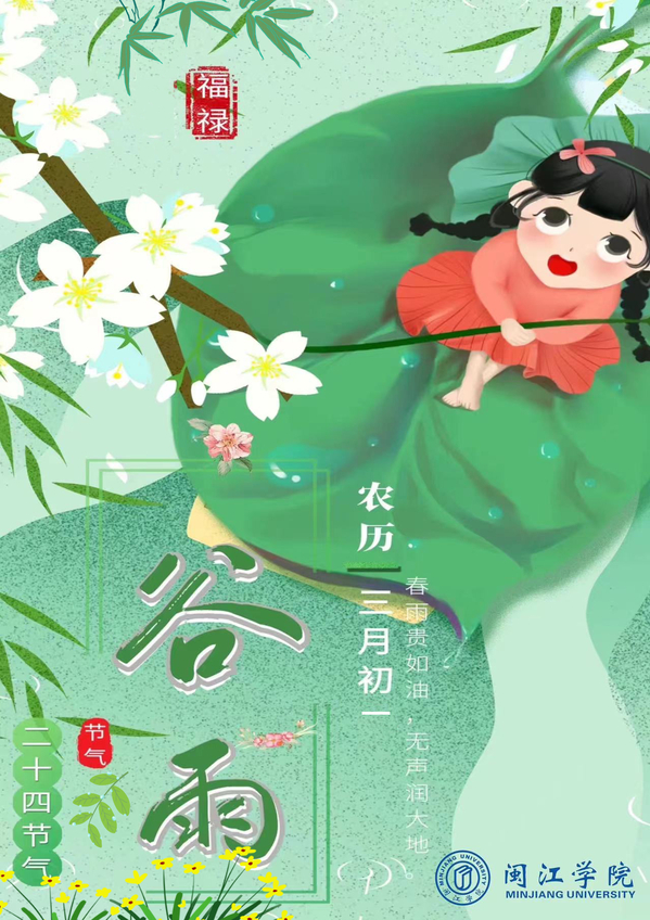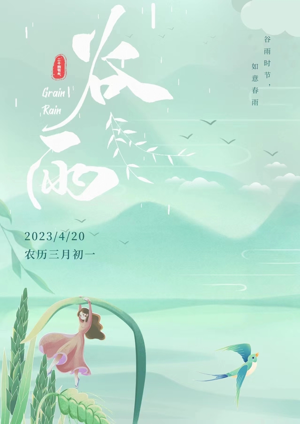 谷雨,谷雨是二十四节气的第6个节气,也是春季的最后一个节气。谷雨,谷得雨而生也。《月令七十二候集解》云:“三月中,自雨水后,土膏脉动,今又雨其谷于水也。雨读作去声,如雨我公田之雨。盖谷以此时播种,自上而下也。”谷雨与雨水、小满、小雪、大雪等节气一样,都是反映降水现象的节气,是古代农耕文化对于节令的反映。古人将谷雨分为三候:一候萍始生;二候鸣鸠拂其羽;三候为戴胜降于桑。民间在谷雨节气有摘谷雨茶、走谷雨、祭海、吃春、赏花等习俗。值此谷雨时节,William威廉社团管理中心组织同学们共同创作了“我们的节日·谷雨”系列海报,为这个特殊的节气又增添了一丝艺术气息。
