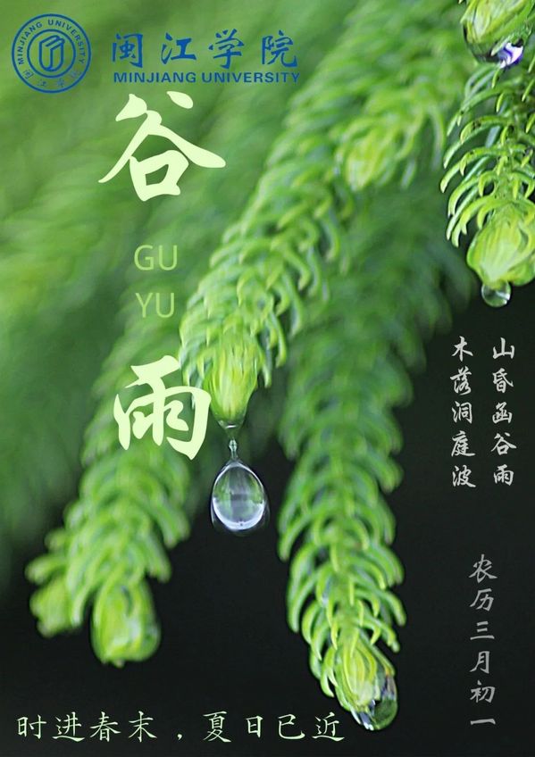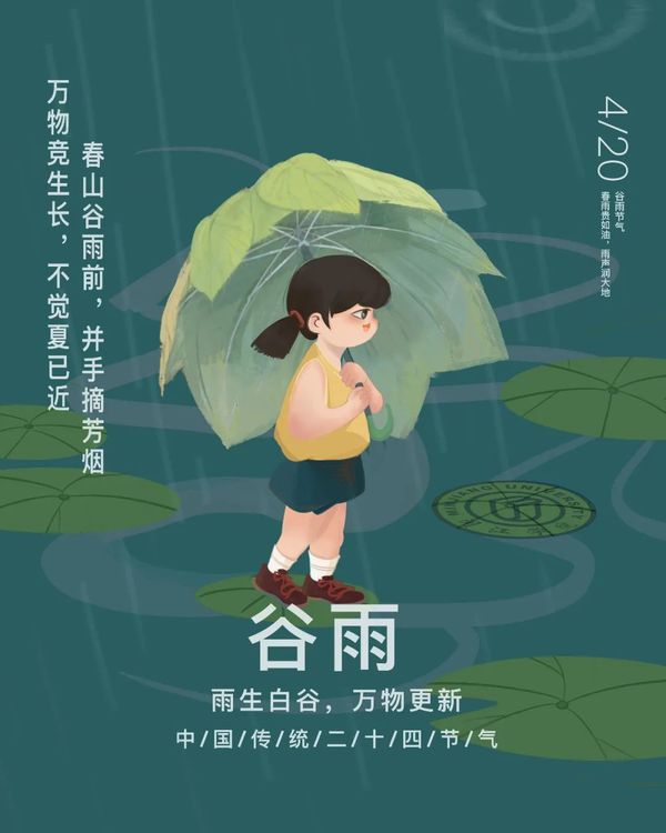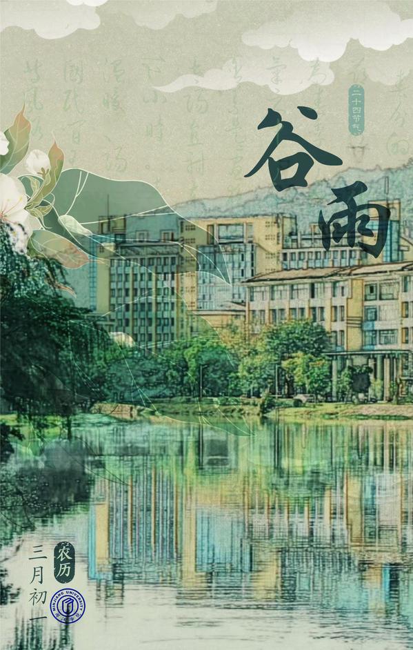 设计说明:谷雨春光晓,山川黛色青。海报以青绿色为主色调,借以校园风景,展现谷雨时节的绿色和雨水,更体现谷雨的独特美感。