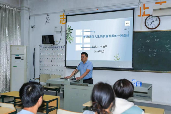 林映平副书记由浅入深地为同学们分析和讲解未来考研形势、专业院校选择、研究生的类型与区别等方面内容。他希望同学们要结合自身学习能力和考研实际情况,理性报考适合自己的专业和院校,制定详细的复习计划并为之努力奋斗,同时也要积极锻炼身体,保持良好的精神状态。