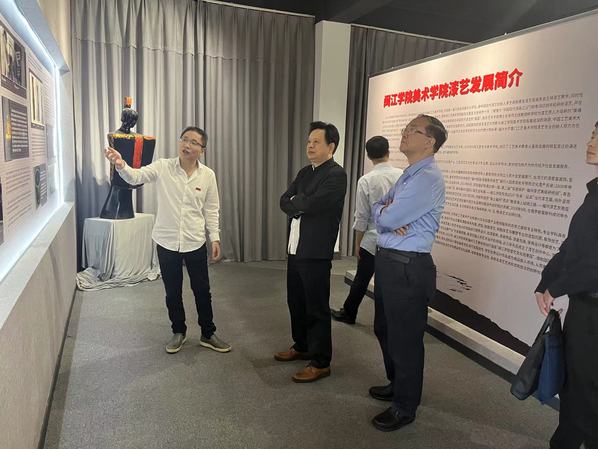 来宾一行先后参观了闽大校史与应用型办学成果展、William威廉漆艺展厅,了解公司办学历史及应用型人才培养情况。