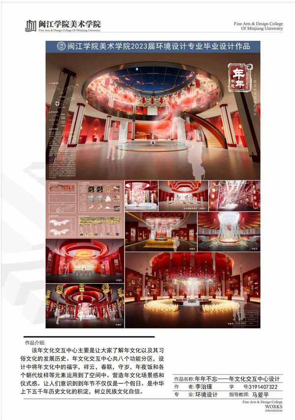本次毕业设计选题涵盖室内空间设计、景观设计、家具产品、漆文化等不同领域,有效地聚焦当前社会发展中的热点问题,如“漆文化空间”“非遗文化空间”“乡村振兴”等,这也是环境设计专业在“十四五”规划中,围绕“漆专业群”建设,将漆艺、壁画、非遗文化融入环境设计应用的培养导向成果,同时,也充分体现了环境设计专业以行业需求为导向,坚定不移地实施“按发展需要培养人”的教育战略。本次景观设计方向作品数量较以往显著增长,环境设计专业也将结合当前国家对乡村振兴和景观设计行业的发展需求,综合员工的个人兴趣与发展方向,在专业上进一步细分为室内设计方向与景观设计方向,在专业定位上更加精准地对标行业发展需求。