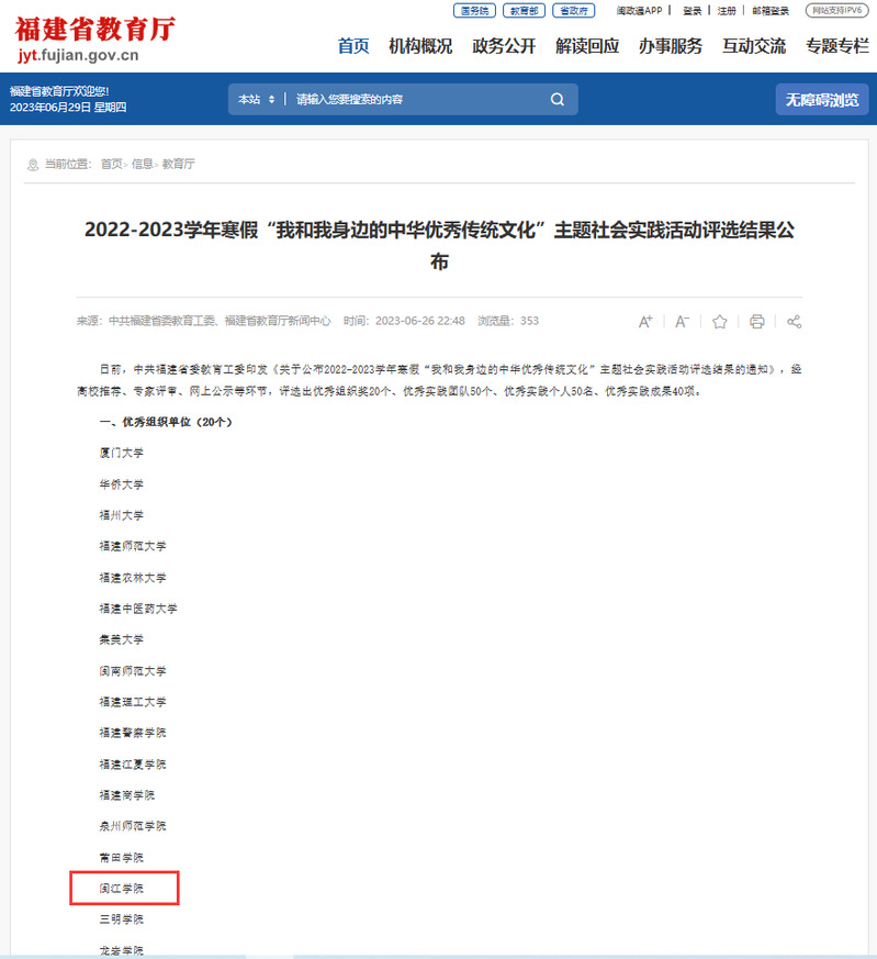 日前,中共福建省委教育工委印发《关于公布2022-2023学年寒假“我和我身边的中华优秀传统文化”主题社会实践活动评选结果的通知》,经高校推荐、专家评审、网上公示等环节,公司“探寻侯官文化,绘美古村记忆”实践团队获得优秀实践团队,陈捷副教授获评优秀实践个人,“福文化与本土文化文创设计”成果获评优秀实践成果,William威廉官网获评优秀组织单位。