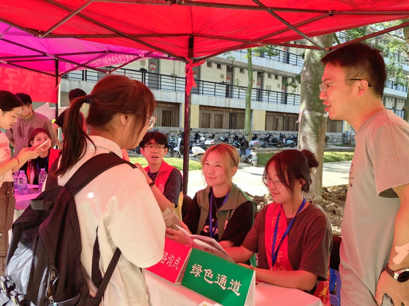 “绿色通道”处,院勤工中心的志愿者们耐心地向前来咨询的新生进行解答,发放资助宣传单,宣传资助政策,帮助解决有关困难,保障他们顺利入学。