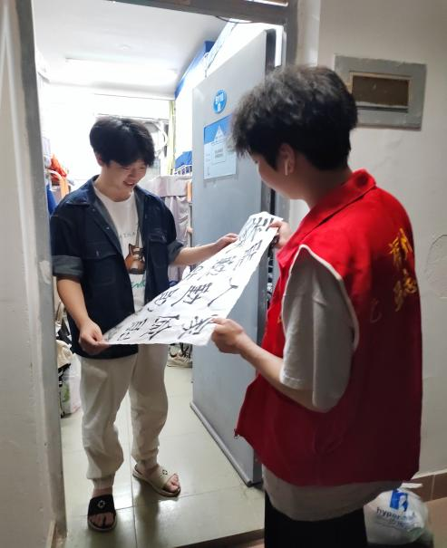 活动结束后,党员们家风家训主题的书法作品送到三区五、三区八员工宿舍舍长手中,将优秀家风家训传承延续下去激励宿舍同学们以艺术的形式营造文明、和谐、向上的舍风。舍长接过作品时高兴地“我将以身作则带领舍员们以实际行动传承优秀家风家训涵育优良‘家风’