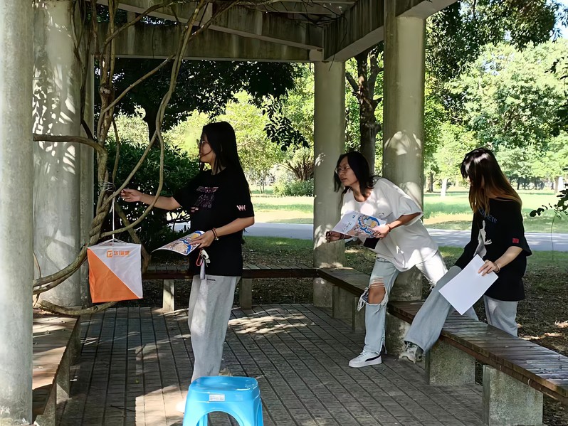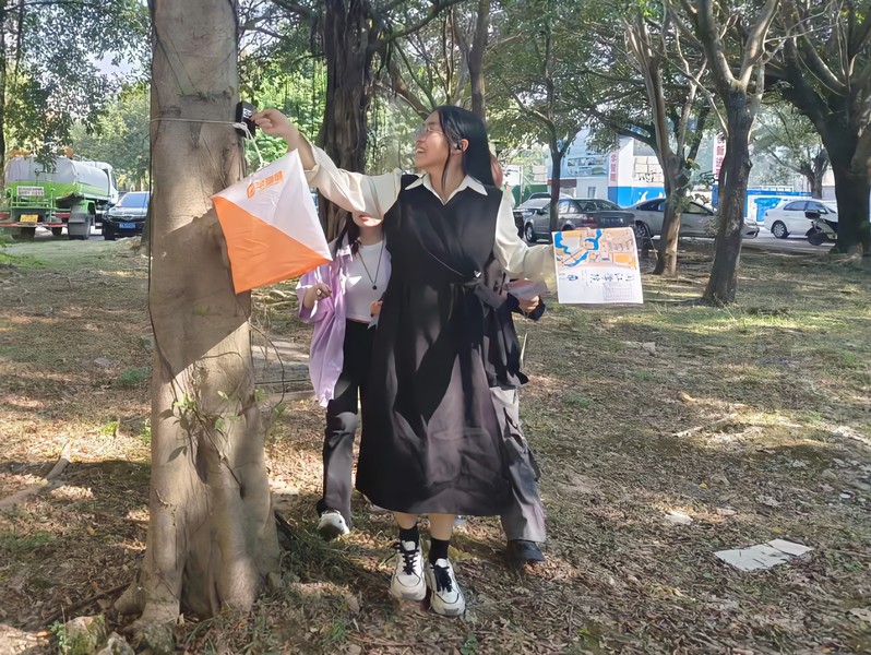 同学们蓄势待发,随着裁判一声令下,比赛正式开始。大家络绎不绝地奔赴打卡点,根据发放的地图线索找到对应的地点,判断最佳路线,找到地图上的点标,完成每个打卡点的任务,并通过指卡接触电子点签器打卡记录比赛成绩,抵达终点后用时较短的即为胜利。