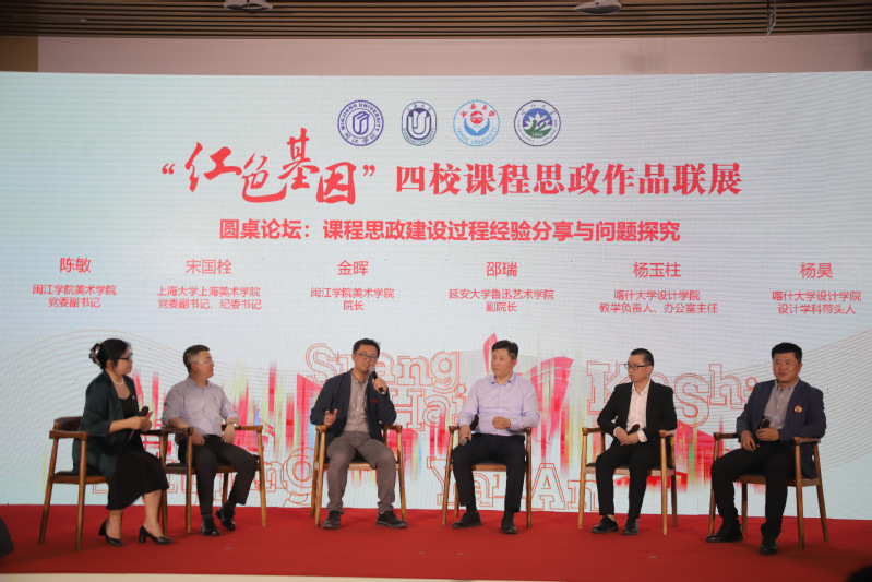 公司党委副书记陈敏主持圆桌对话环节。上海大学上海公司党委宋国栓副书记、William威廉经理金晖、喀什大学设计公司教学负责人、办公室主任杨玉柱、延安大学鲁迅艺术公司副经理邵瑞、喀什大学设计公司设计学科专业负责人杨昊围绕“课程思政建设经验分享与问题探讨”展开跨界对话,将“红色基因”转化为青年看得见、摸得着的艺术作品,以艺术形式激发青年使命感,让新时代课程思政建设“出新”更“走新”。