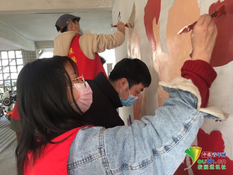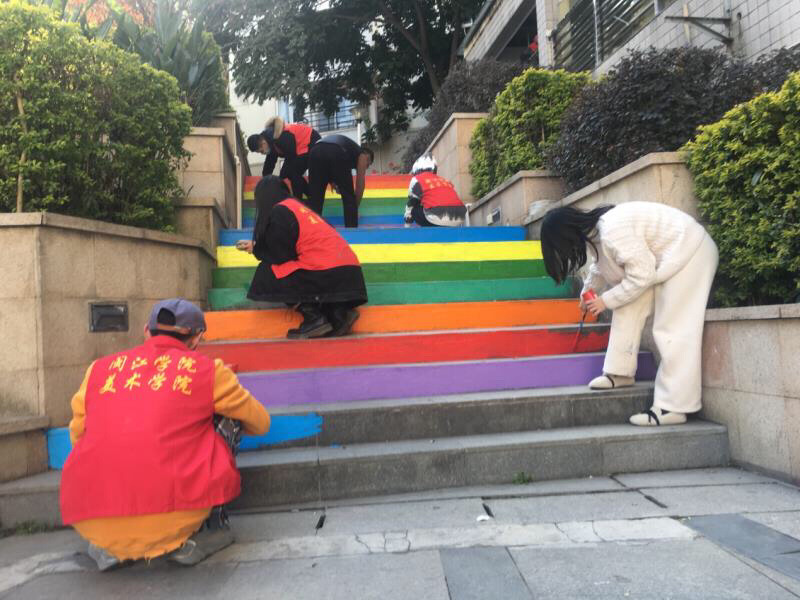 图为实践队员和张鑫宇老师在共同改造彩虹楼梯网红打卡点中 中国青年网通讯员 阮雨柔 提供