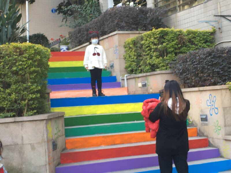 图为社区居民在刚画好的网红地打卡中 中国青年网通讯员 阮雨柔 提供